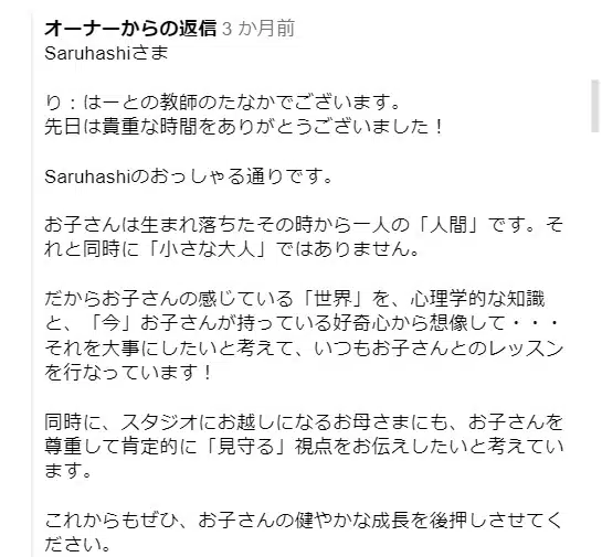 そして、子どもや親への否定は全くせず、これからどう触れ合っていくとより成長を促せるか教えていただきました。今現在1ヶ月ほど経ちますが、伺ってからみるみる新しいことを始めて驚いております!本当に行って良かったです。