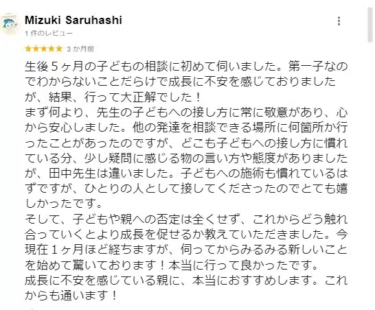 まず何より、先生の子どもへの接し方に常に敬意があり、心から安心しました。他の発達を相談できる場所に何箇所か行ったことがあったのですが、どこも子どもへの接し方に慣れている分、少し疑問に感じる物の言い方や態度がありましたが、田中先生は違いました。子どもへの施術も慣れているはずですが、ひとりの人として接してくださったのでとても嬉しかったです。
