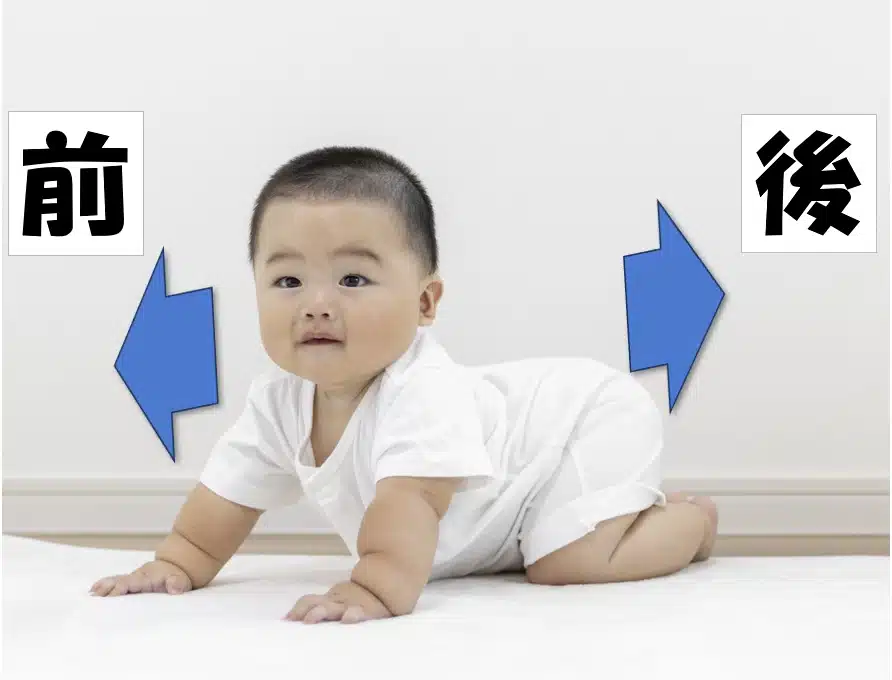 つまり、前に進めることに気がつくと「ハイハイ」、後ろに進めることに気がつくと「お座り」に発展するのです。