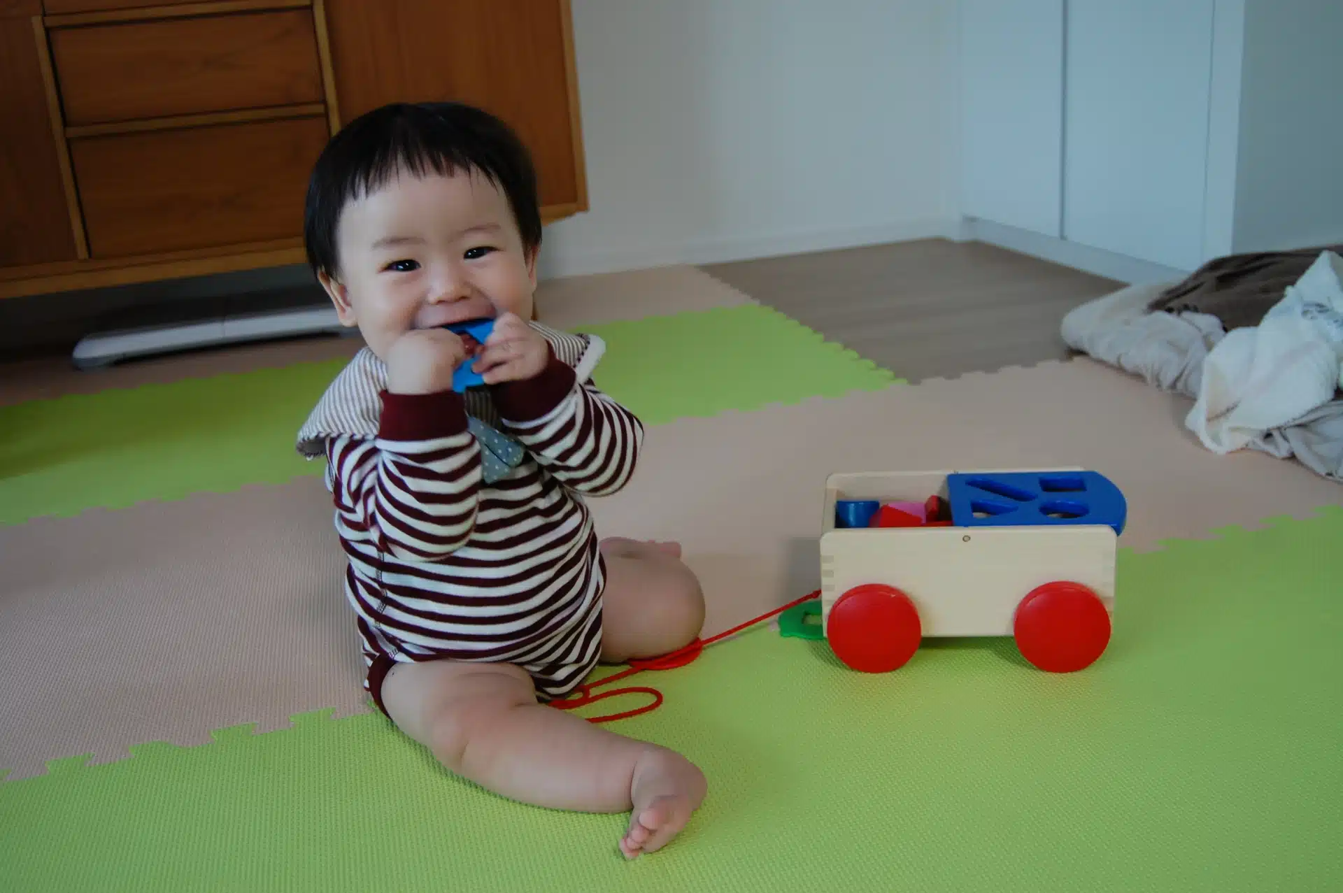 大人が座らせるとこのお座りになる赤ちゃんもいますが・・・この姿勢を変える経験が不足するとここから動けない⇒シャフリングへと向かう要因になります。