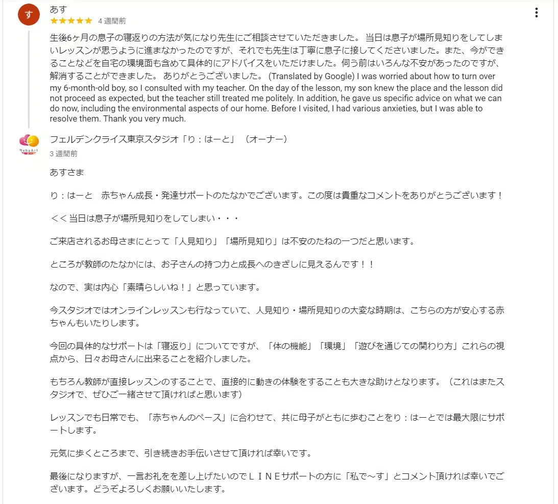 赤ちゃんの体・運動発達サポートのレッスンをお受け頂いたお客さまの感想を頂きました。